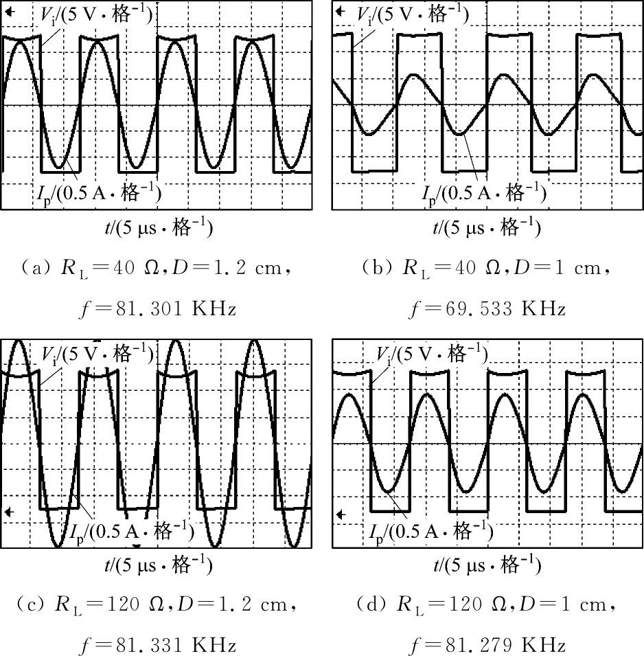 不同传输距离及负载电阻情况下,谐振补偿网络输入电压Vi及原边线圈电流Ip波形如图8所示。
