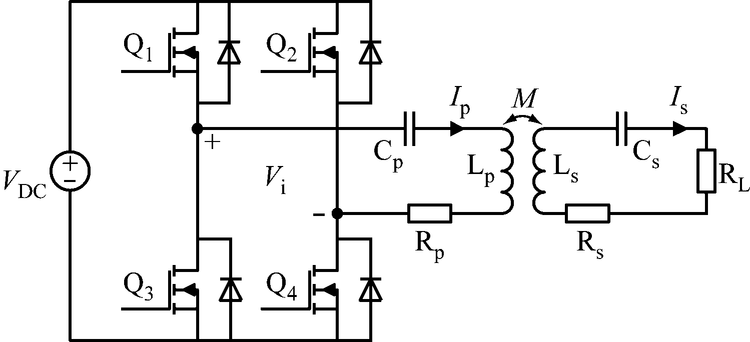 MC-WPT系统按照原副边补偿电容与电感的相对位置(S代表电容和电感串联,P代表电容和电感并联),可分为SS,SP,PS,PP型4种基本拓扑结构,其中前两者属于电压型系统,后两者属于电流型系统。本文以SS型MC-WPT系统为例进行分析,其等效电路如图1所示。Cp,Cs分别为原副边补偿电容;Lp,Ls分别为原副边线圈电感;Ip,Is分别为原副边线圈电流;Rp,Rs分别为原副边线圈内阻;M为原副边线圈之间的耦合互感;RL为负载电阻;开关管Q1—Q4组成全桥逆变电路;VDC为系统输入直流电压源;Vi为谐振补偿网络输入电压。