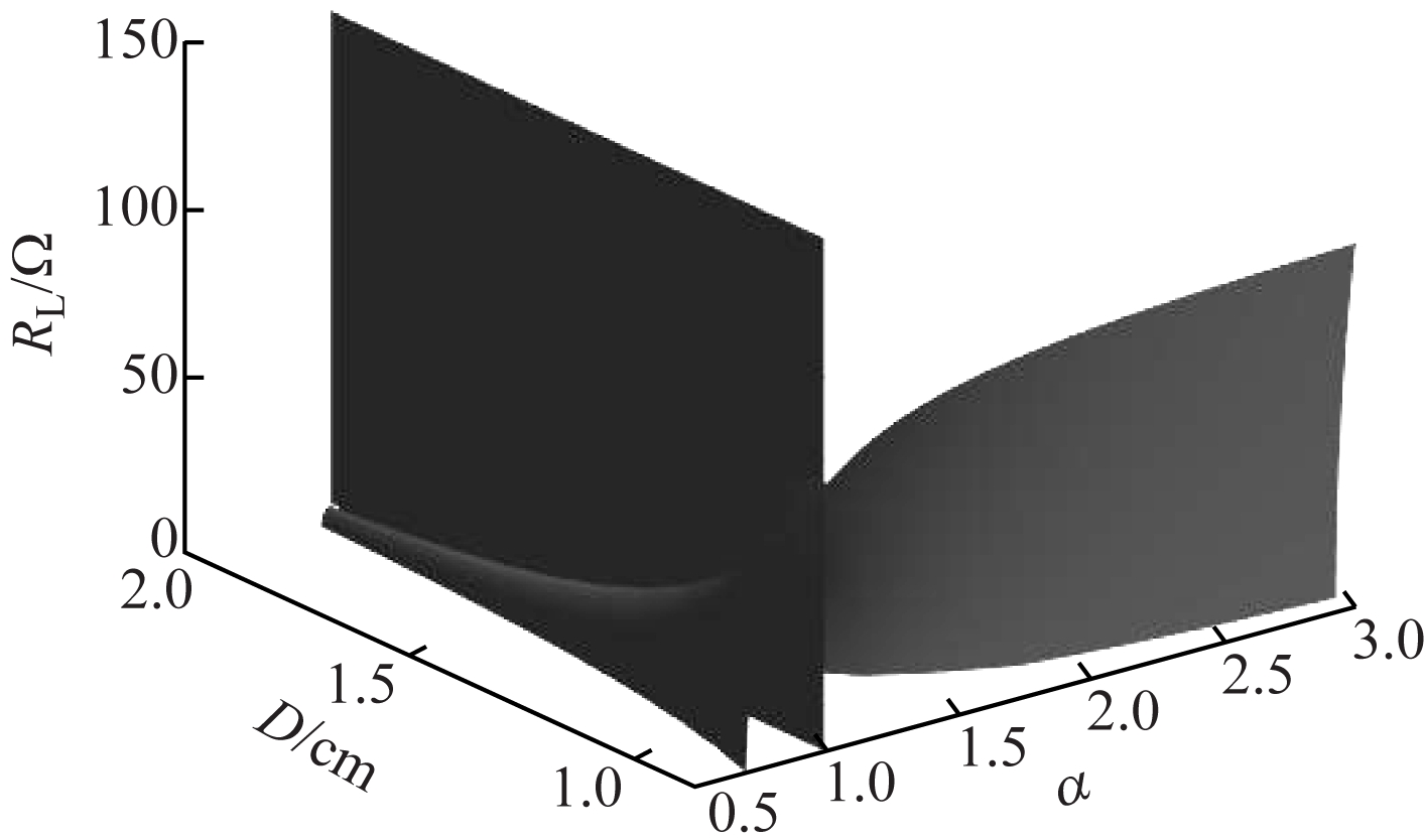 在Matlab中根据式(10)绘制系统原边阻抗虚部为0的三维等值面,如图2所示。可看出随着传输距离D及负载电阻RL的变化,除了α=1以外,还出现了1个或2个不为1的α均能使系统原边阻抗虚部为0;当RL≥109.6 Ω(根据式(15)计算的理论临界值)时,令原边阻抗虚部为0的α恒为1,不受传输距离的影响。