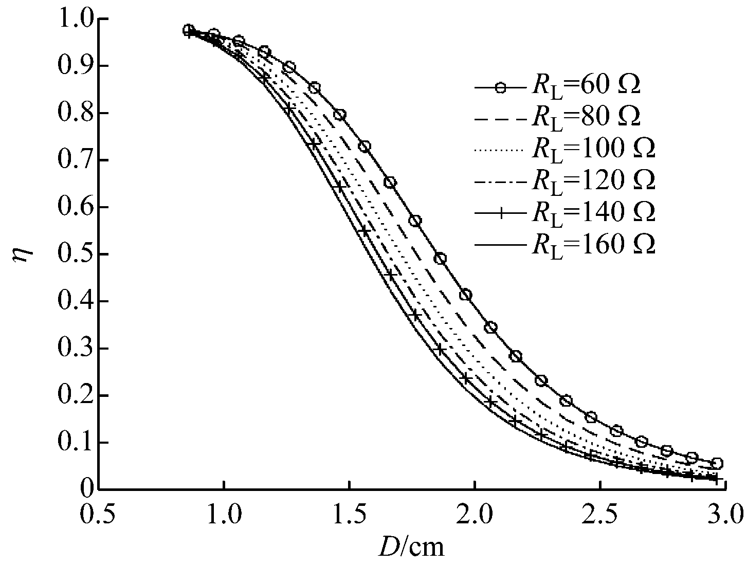 Fig.6 Curves of transfer efficiency varying with transfer distance and load resistance