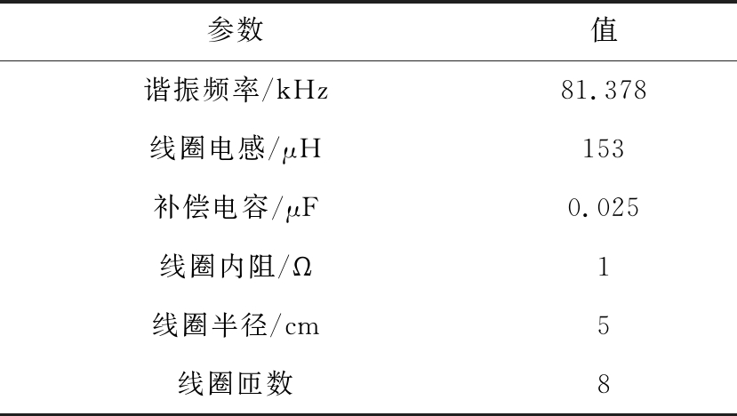 参数值谐振频率/kHz81.378线圈电感/μH153补偿电容/μF0.025线圈内阻/Ω1线圈半径/cm5线圈匝数8