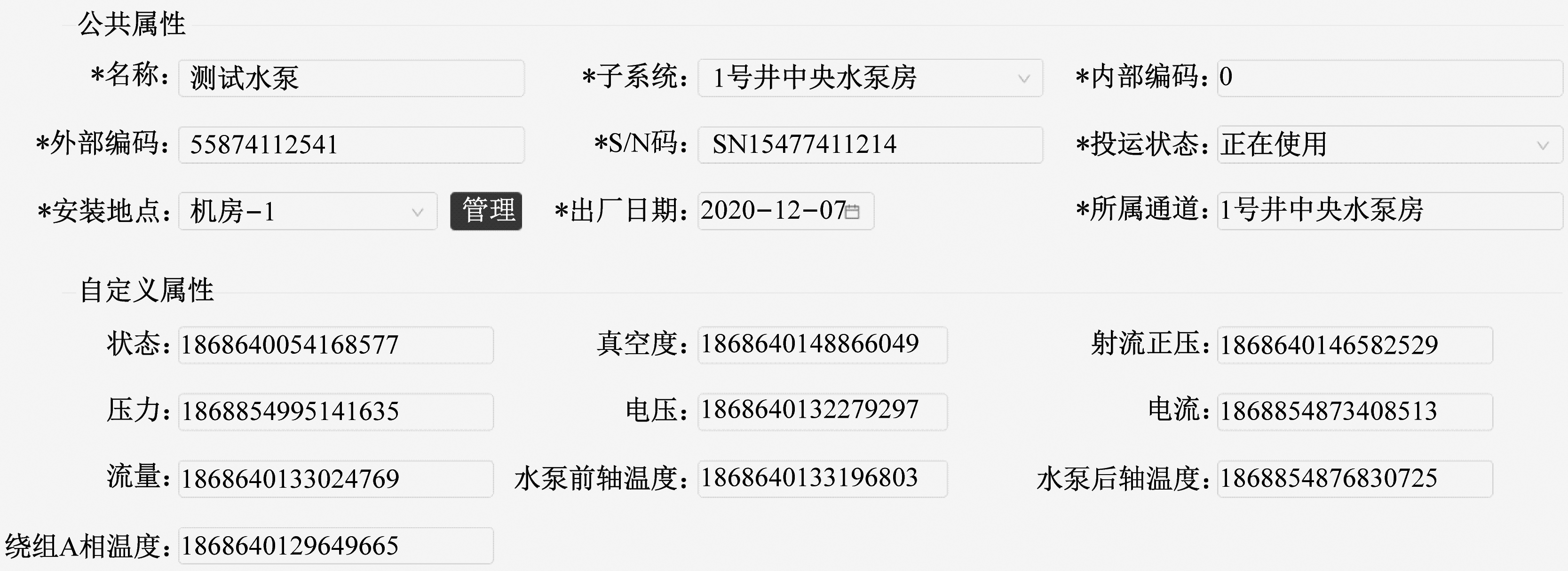 当需要查看设备实例的详细信息时,通过动态页面展示信息,如图4所示。显示区域分为公共属性区域和自定义属性区域:公共属性区域根据设备所属类别使用不同的子页面进行展示;自定义属性区域根据设备模型中定义的自定义属性类型动态生成输入框、下拉选择框、单选框等页面元素,之后根据自定义属性的配置项初始化页面元素,如初始值、数据范围、是否只读和下拉选择框选项内容等。