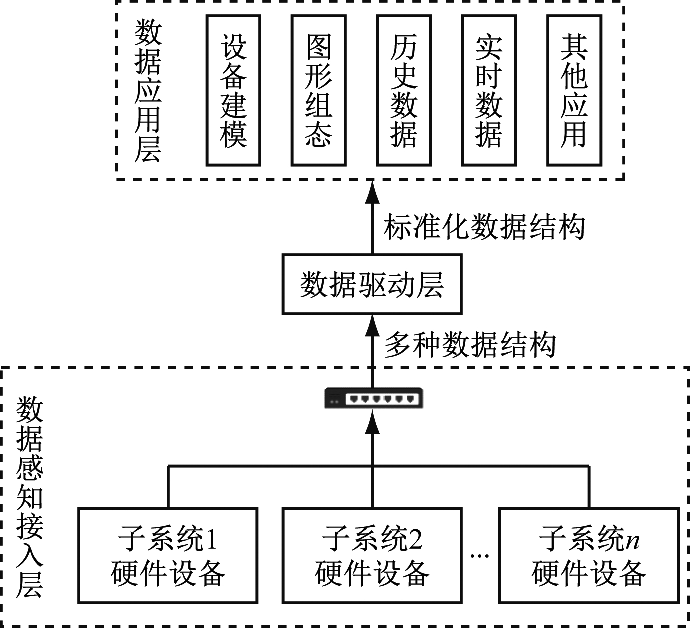 面向对象的设备建模是一种无代码设备模型创建模式,该模式的运行需要依赖标准化的数据结构。在多系统融合场景中,数据标准化流程如图1所示。在数据感知接入层,各子系统硬件设备通过多种通信方式将数据上传至数据驱动层;数据驱动层将非标准化的原始数据转换为标准化数据;数据应用层使用标准化数据完成设备建模等功能。