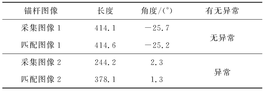 锚杆图像长度角度/(°)有无异常采集图像1414.1-25.7匹配图像1414.6-25.2无异常采集图像2244.22.3匹配图像2378.11.3异常