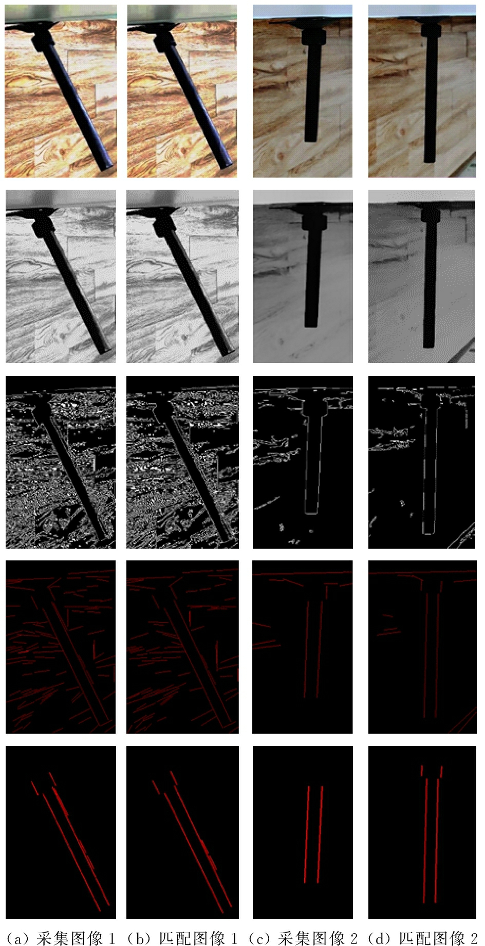 从图5可看出,经筛选后的平行直线段有多组,都是表示锚杆的直线段,本文选择其中最长的直线段作为锚杆特征直线段,提取锚杆长度与角度,并用以判断锚杆是否存在异常。提取结果见表1。由于本文方法只需判断提取的锚杆特征相对于原始图像是否存在较大差异,所以未将锚杆长度特征换算为实际单位。可看出采集图像与匹配图像中的锚杆长度和角度特征都被成功提取出来;采集图像1中锚杆虽然与匹配图像1中并不完全相同,但考虑图像采集过程中抖动等因素,该误差在允许范围内,因此判断锚杆无异常;采集图像2中锚杆长度与匹配图像2相比变化较大,判断锚杆存在异常。