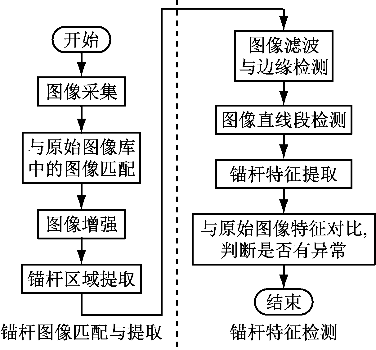 (1) 根据锚杆出现异常时露出段长度、角度会发生变化的特点,以巷道巡检机器人为平台,采用机器视觉技术对锚杆异常进行检测。检测过程由锚杆图像匹配与提取、锚杆特征检测组成。