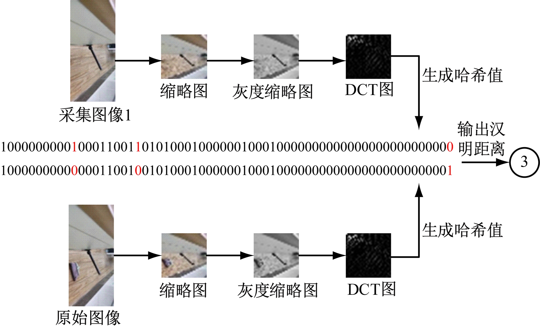 以采集图像1为例,说明其与原始图像的匹配过程,如图2所示。采用感知哈希算法对采集图像1进行缩放、灰度化、DCT后,计算图像哈希值。原始图像库中有80张图像,其哈希值为预先计算得到。根据哈希值计算汉明距离,得到采集图像1与其匹配图像的汉明距离为3,为采集图像1与原始图像哈希值之间汉明距离最小值。采用相同方法进行采集图像2与原始图像匹配,得到采集图像2与其匹配图像的汉明距离为4。
