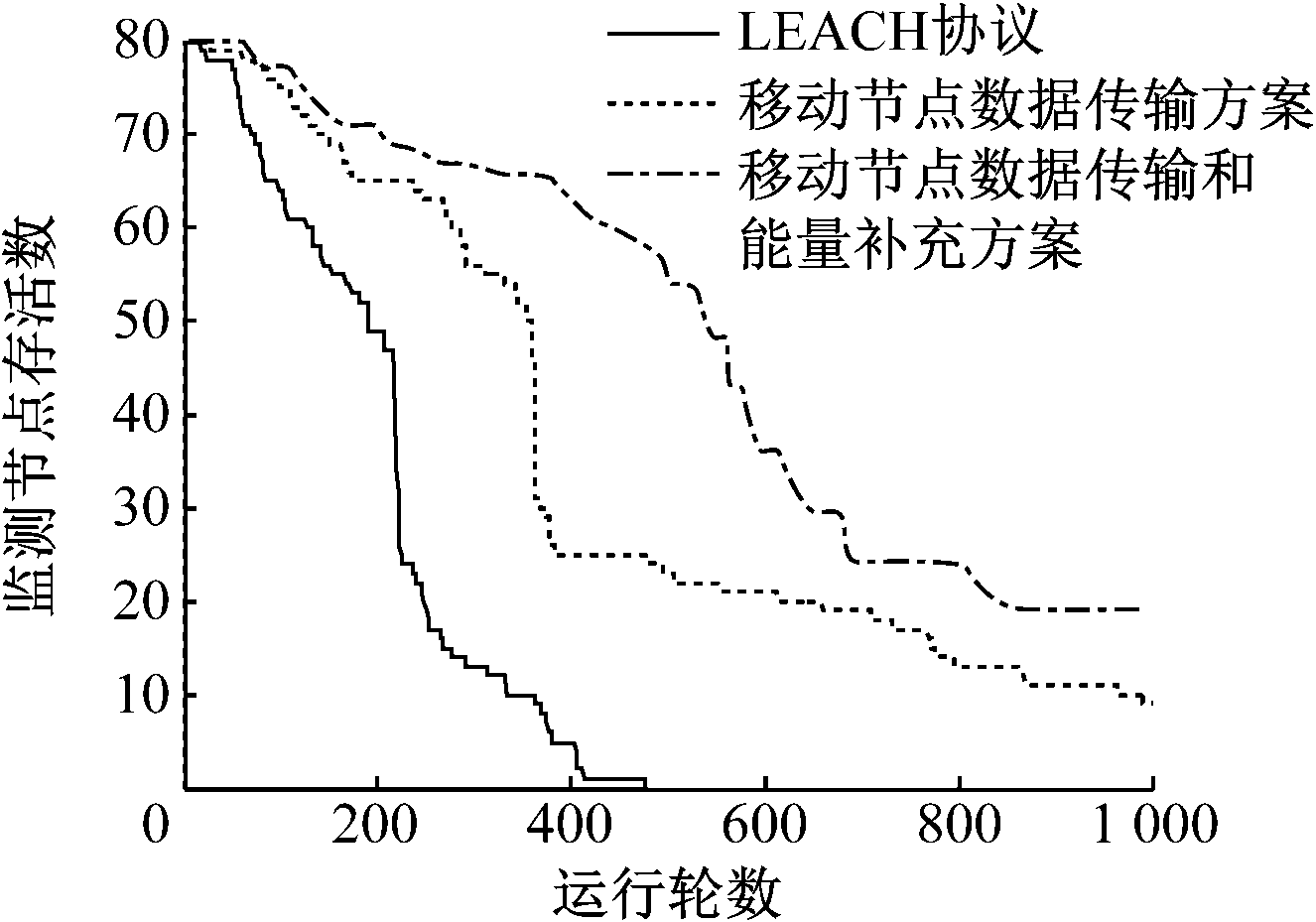 无线监测网络监测节点存活数仿真结果如图7所示。可看出随着网络运行轮数增加,网络内存活的监测节点不断减少,这是由于监测节点不断采集、发送数据,导致其能量耗尽而死亡;网络运行轮数相同时,网络在采用LEACH协议、移动节点数据传输方案、移动节点数据传输和能量补充方案时,存活的监测节点数依次增多。