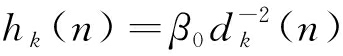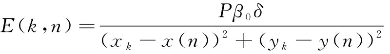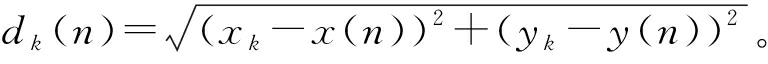式中:β0为单位信道增益;dk(n)为在第n个时隙移动节点到第k个监测节点的距离,![]()
