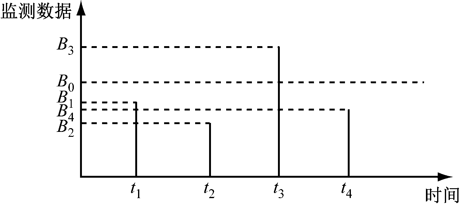 以监测节点S1数据到达模型(图4)为例说明基于移动节点的数据传输方案。B0为传输阈值。假设移动节点在t4时刻到达S1通信范围内,S1每次发送数据的能耗为E1。在t1时刻,S1监测到数据B1,判断移动节点尚未到达其通信范围,B1<B0,不发送B1,S1等待下一次监测数据。在t2时刻,S1监测到数据B2,判断移动节点尚未到达其通信范围,B2<B0,不发送B2,S1等待下一次监测数据。在t3时刻,S1监测到数据B3,判断移动节点尚未到达其通信范围,B3>B0,立即发送B3,耗能E1。在t4时刻,S1监测到数据B4,判断移动节点到达其通信范围,立即发送B4,耗能E1。上述过程共耗能2E1。若采用周期性监测发送模式而无移动节点转发,则耗能4E1。可见,基于移动节点的数据传输方案减少了冗余数据发送和监测节点能耗。