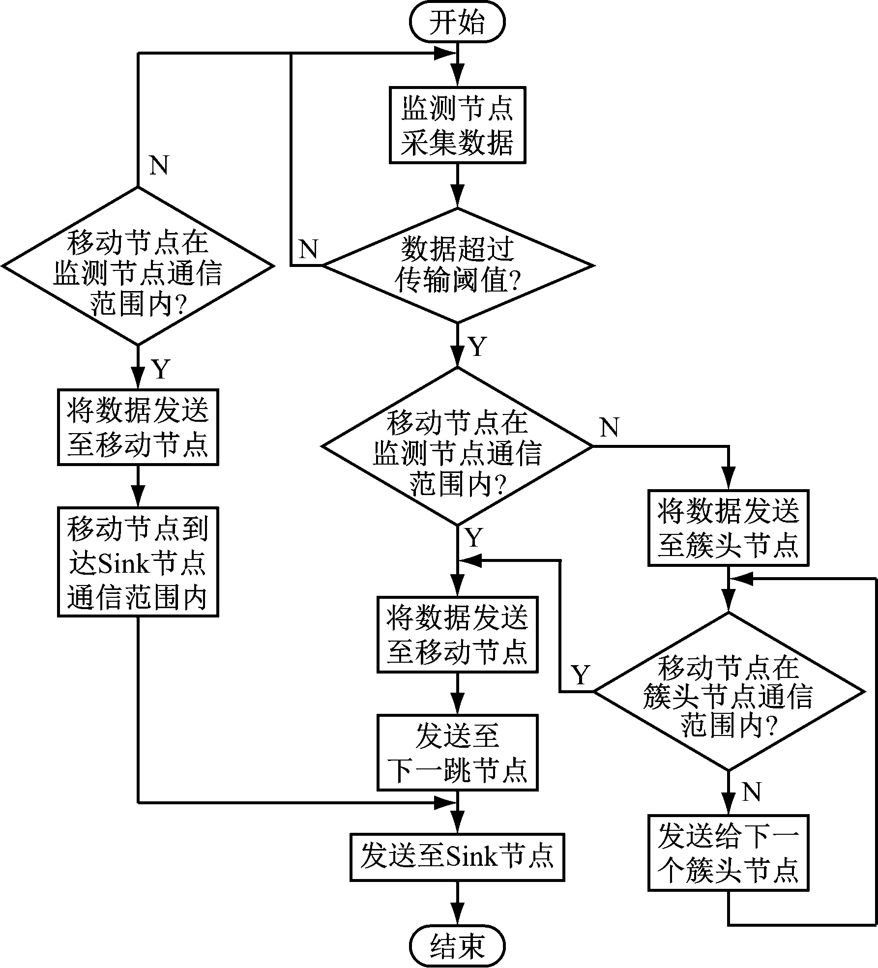 (2) 紧急传输模式。当监测节点采集数据超过传输阈值时,监测节点判断移动节点是否在其通信范围内,若是则将数据发送至移动节点,反之将数据发送至簇头节点。簇头节点接收到数据后,判断移动节点是否在其通信范围内,即优先选择移动节点转发数据,最终将数据经簇头节点和移动节点转发至最近的Sink节点。