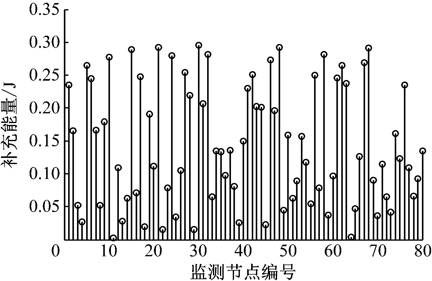 监测节点获得的补充能量仿真结果如图6所示。可看出节点获得的能量不均衡,原因是各节点监测任务不同,且受监测数据大小、数据采集和传输周期、与Sink节点距离等因素影响,监测节点在单位时间内的能耗不同。移动节点根据监测节点能耗需求对其进行能量补充,实现了实际意义上的能量均衡。