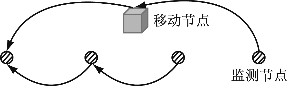 监测节点周期性地采集工作面环境数据,通过多跳转发或移动节点转发方式将数据传输到Sink节点。移动节点可移动至Sink节点通信范围内,所以监测节点应尽量选择移动节点来转发数据,取代传统的多跳转发模式。加入移动节点转发的路由如图2所示。