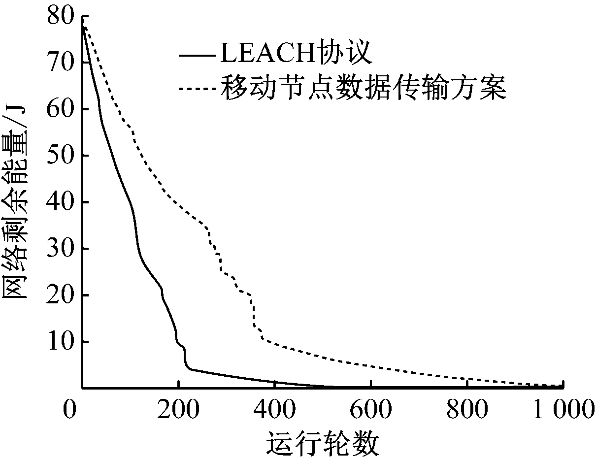 网络剩余能量仿真结果如图5所示。可看出采用LEACH协议时,无线监测网络在运行200轮后剩余能量为10 J,运行475轮后能量耗尽;加入移动节点后,网络运行200轮后剩余能量为40 J,运行1 000轮后能量耗尽。主要原因是在LEACH协议基础上加入移动节点后,监测节点会尽量选择移动节点转发数据,簇头节点不再是1跳将数据传输给Sink节点,而是选择移动节点和其他簇头节点转发,避免了区域中心监测节点因离Sink节点远而过早地耗尽能量,同时通过设定传输阈值,减少了冗余数据重复发送。