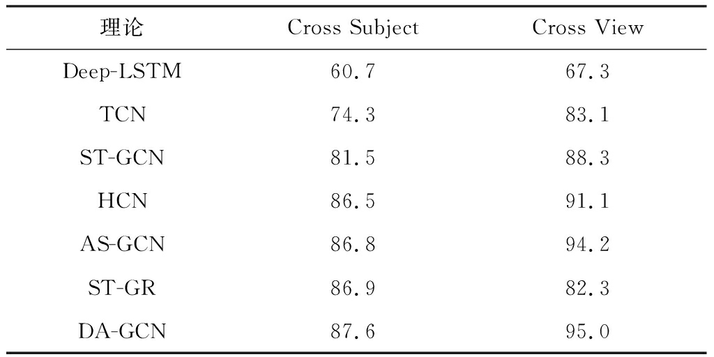 与Deep LSTM[7],TCN[11],ST-GCN[8],HCN[12],AS-GCN[13]以及ST-GR[14]算法进行对比,结果见表2。采用Cross Subject(CS)和Cross-View(CV)为2种评估协议对数据集进行验证。CS评估协议由20名受试者完成的动作构成训练集,其余20名受试者完成的动作用于测试。对于CV评估协议,前2个摄像头捕获的样本用于训练,其余用于测试。由表2可知,根据评估协议CS和CV,DA-GCN在NTU-RGBD数据集上的准确率分别为87.6%,95.0%。