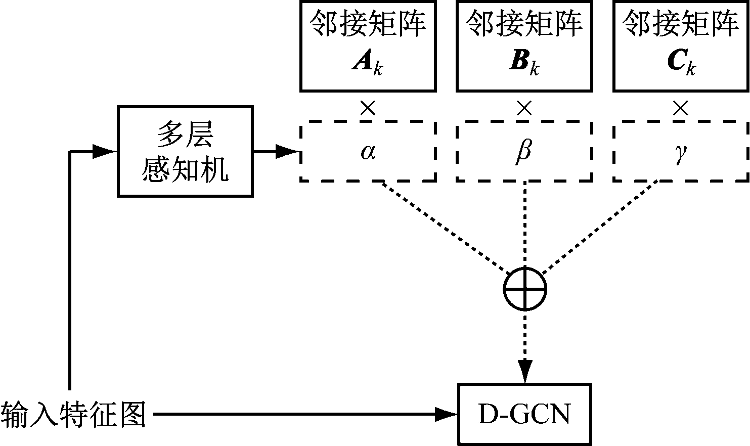 D-GCN的聚合过程如图2所示。特征图输入后,通过多层感知机计算邻接矩阵的注意力参数,加权得到D-GCN图卷积核。