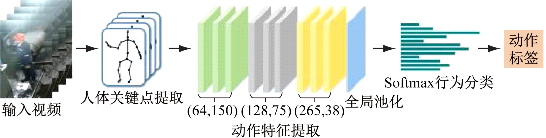 随着深度学习的发展,通过卷积神经网络(Convolutional Neural Network, CNN)和循环神经网络(Recurrent Neural Network, RNN)学习人体行为特征逐渐成为主流。文献[6]提出一种端对端的时间卷积网络来实现动作识别,使用CNN将骨架数据建模为伪图像,并对伪图像进行卷积操作。文献[7]提出了一种双向分层RNN网络来识别骨骼序列,对时序数据处理效果良好,但是对每一个时间帧内的空间信息提取效果不佳。近年来,图卷积网络(Graph Convolutional Network, GCN)为基于骨架点的行为识别提供了一种新的捕捉关节依赖的方法。文献[8]建立了时空图卷积网络(Spatial Temporal Graph Convolutional Network,ST-GCN),该网络构建了以关节为节点、骨架为边的骨架图结构,并使用GCN和时间卷积网络(Temporal Convolutional Network, TCN)分别从骨架图中提取时空特征。为了捕获非骨骼直接连接的关节特征,文献[9]提出了一种双流自适应图卷积网络(2S-AGCN)。