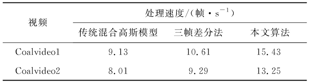 三帧差分法、传统混合高斯模型和本文算法的处理速度见表1。对于视频Coalvideo1,本文算法的处理速度比传统混合高斯模型和三帧差分法分别提高了65.7%和45.4%;对于视频Coalvideo2,本文算法的处理速度比传统混合高斯模型和三帧差分法分别提高了65.4%和42.6%。实验结果验证了本文算法可有效提高视频处理速度。