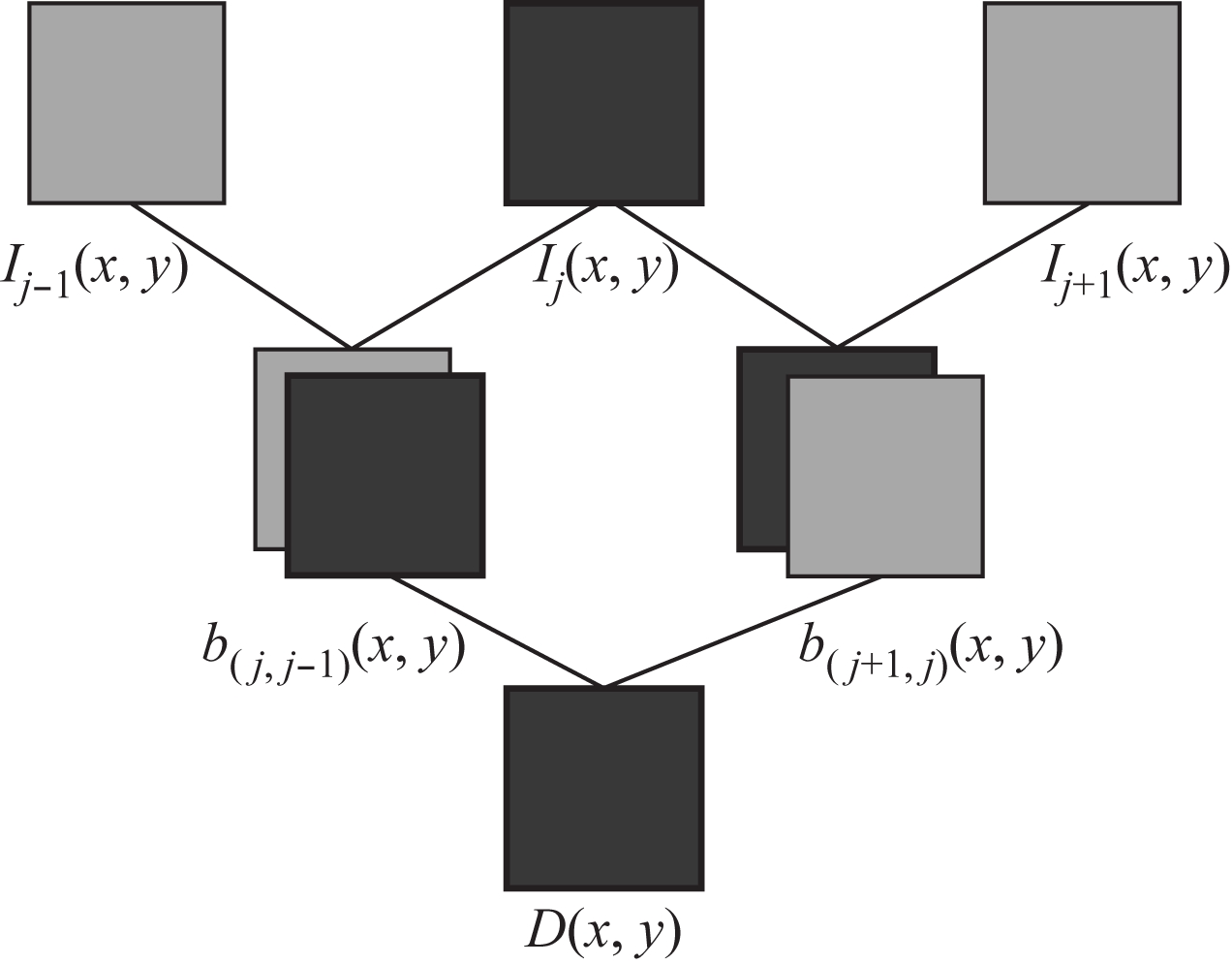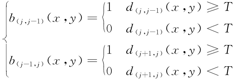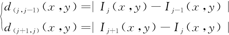 在帧差法的基础上对混合高斯模型进行改进。帧差法通过计算图像帧之间的差值进行目标检测,两帧差分法易发生“空洞”现象,三帧差分法则是利用3帧图像中的相邻2帧进行差分计算,可以获得较好的图像检测效果。选取3帧图像Ij-1(x,y),Ij(x,y),Ij+1(x,y),分别计算相邻2帧的差值: