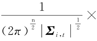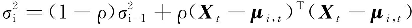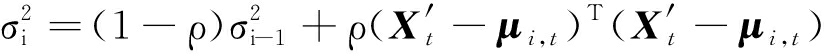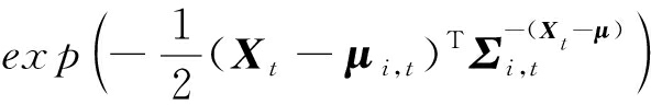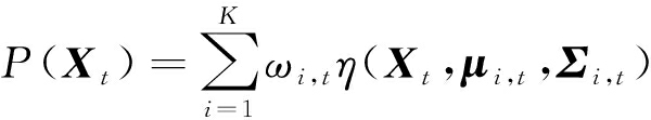 式中:ωi,t为第i个高斯分布在t时刻的权重;η为高斯分布的概率密度函数;μi,t为第i个高斯分布在t时刻的期望;Σi,t为第i个高斯分布在t时刻的协方差矩阵。