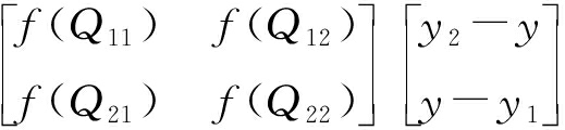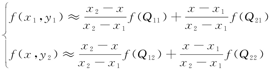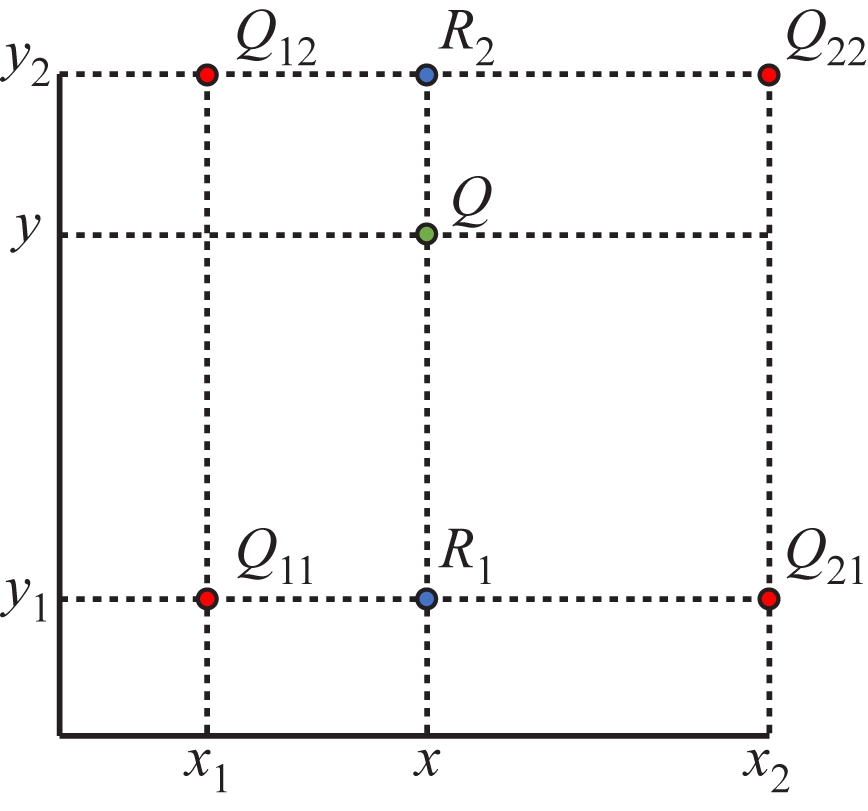 假设已知函数 f 在点Q11 (x1,y1),Q12 (x1,y2),Q21 (x2,y1)及Q22 (x2,y2)处的值,要得到 f 在点Q(x, y)处的值,在 x 方向进行线性插值,得