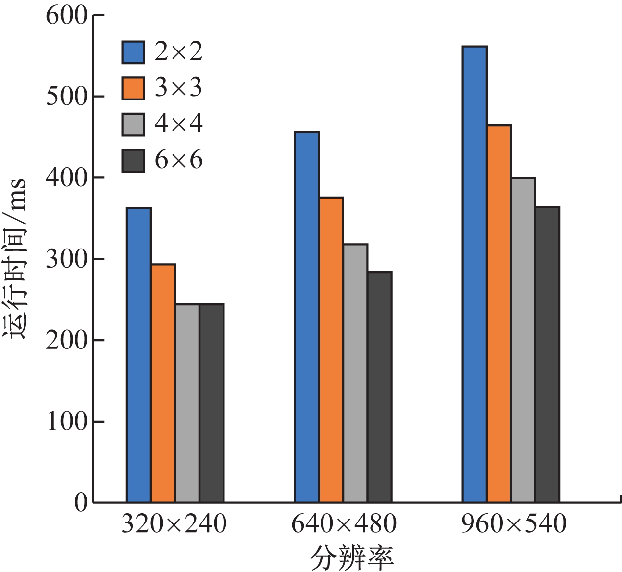 文献[16]得出分辨率为320×240的视频最佳分块数为2×2,但是其忽略了视频分辨率变化的问题,即分辨率高于320×240时可能2×2分块不适用。本文通过对320×240、640×480和960×540三种分辨率规格视频中的10帧使用2×2、3×3、4×4、6×6四种分块策略进行实验,通过分析算法运行时间和检测效果得到更佳的分块策略,实验结果如图2所示。