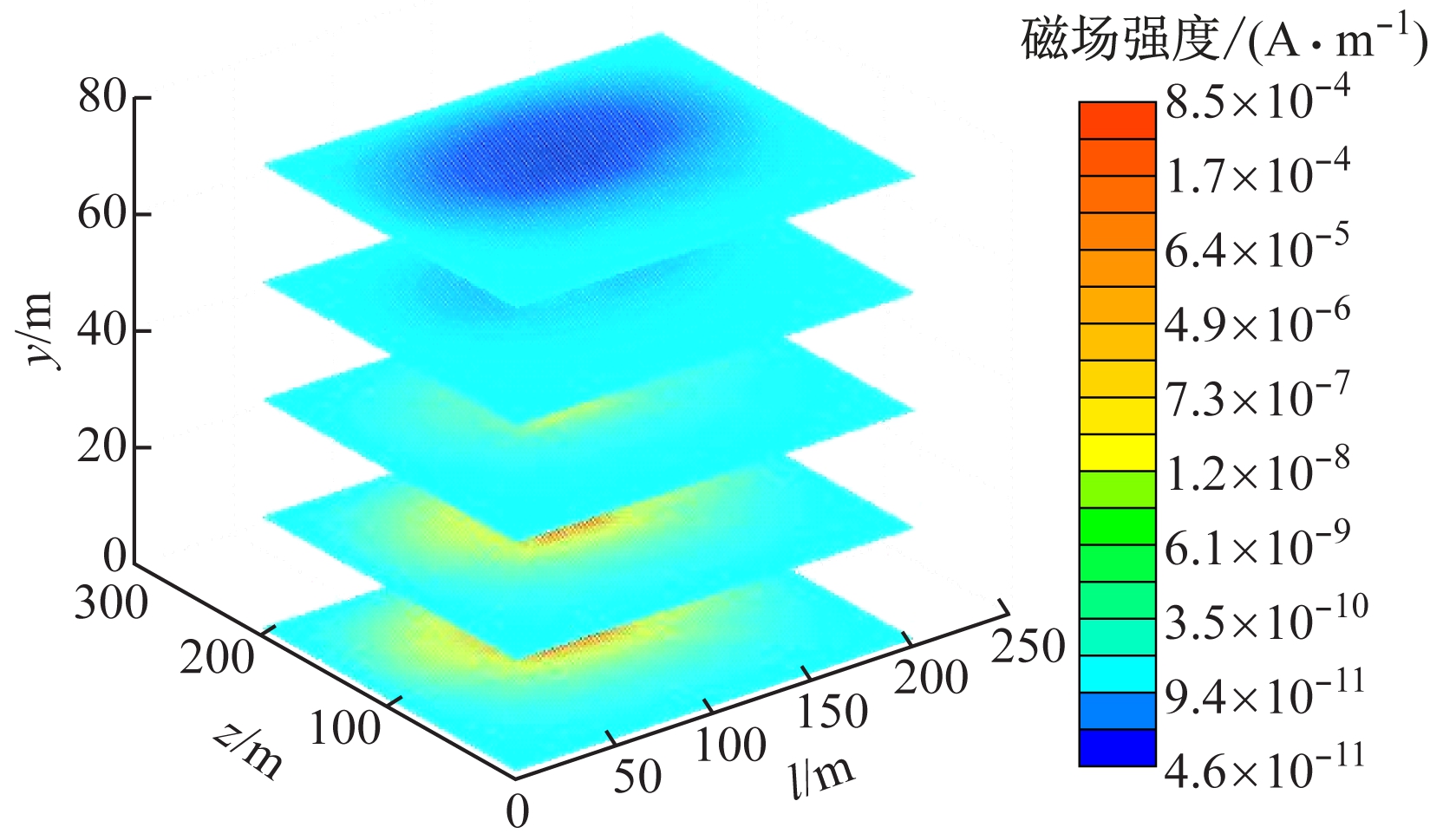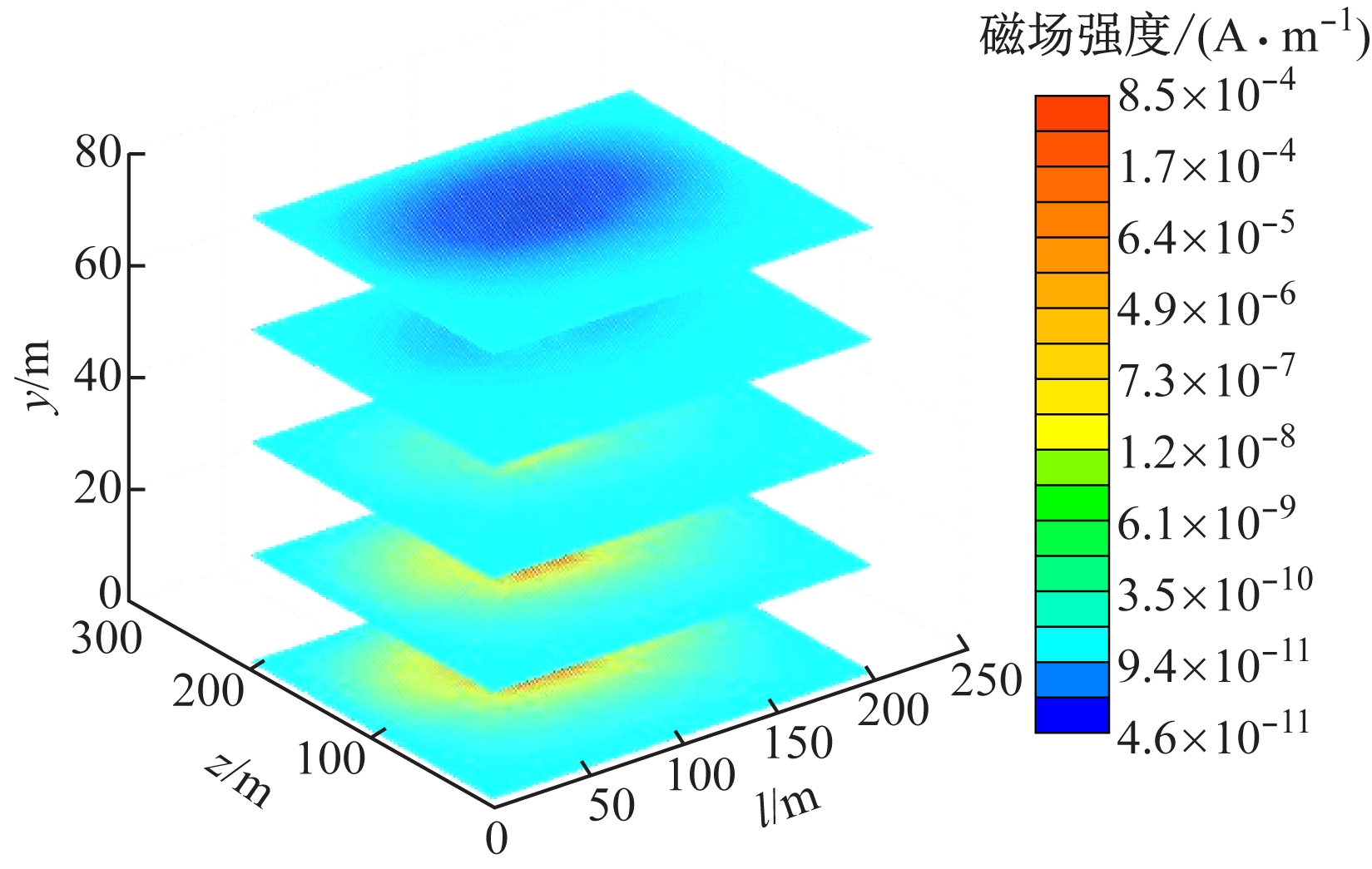 激发源位于l=100 m,z=0处,通过发射线框发射一次脉冲磁场,并分析磁场在模型地层中的传播规律[15-17]。时间步长为800,1 600时Q型地电模型瞬变电磁场扩散切片如图3所示,其中y为与层状地层走向垂直方向距巷道顶板的距离,在巷道顶板处y=0。从图3可看出,自y=0断面向y=80 m断面,磁场强度值及扩散范围均逐渐变小;z>100 m范围内的磁场扩散速率大于z<100 m范围内的磁场扩散速率,反映了z>100 m范围内的电阻率高于z<100 m范围内的电阻率,与地层模型中设置的电阻率相对应。综合分析可知,随着时间的增加,磁场扩散范围明显增大;因为磁场在扩散过程中不断衰减,所以靠近激发源处磁场强度值较大,远离激发源处磁场强度值较小。