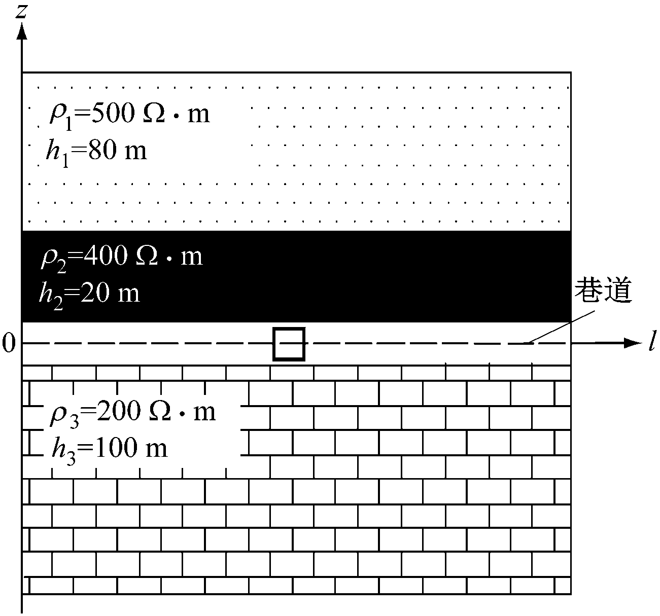 以煤矿井下(含巷道)全空间水平层状地层为基础建立典型的3层模型,进行二维反演模拟,验证反演算法的准确性,从而为实际资料的反演提供参考。Q型地电模型如图2所示,l轴表示模型长度,z轴表示模型宽度。