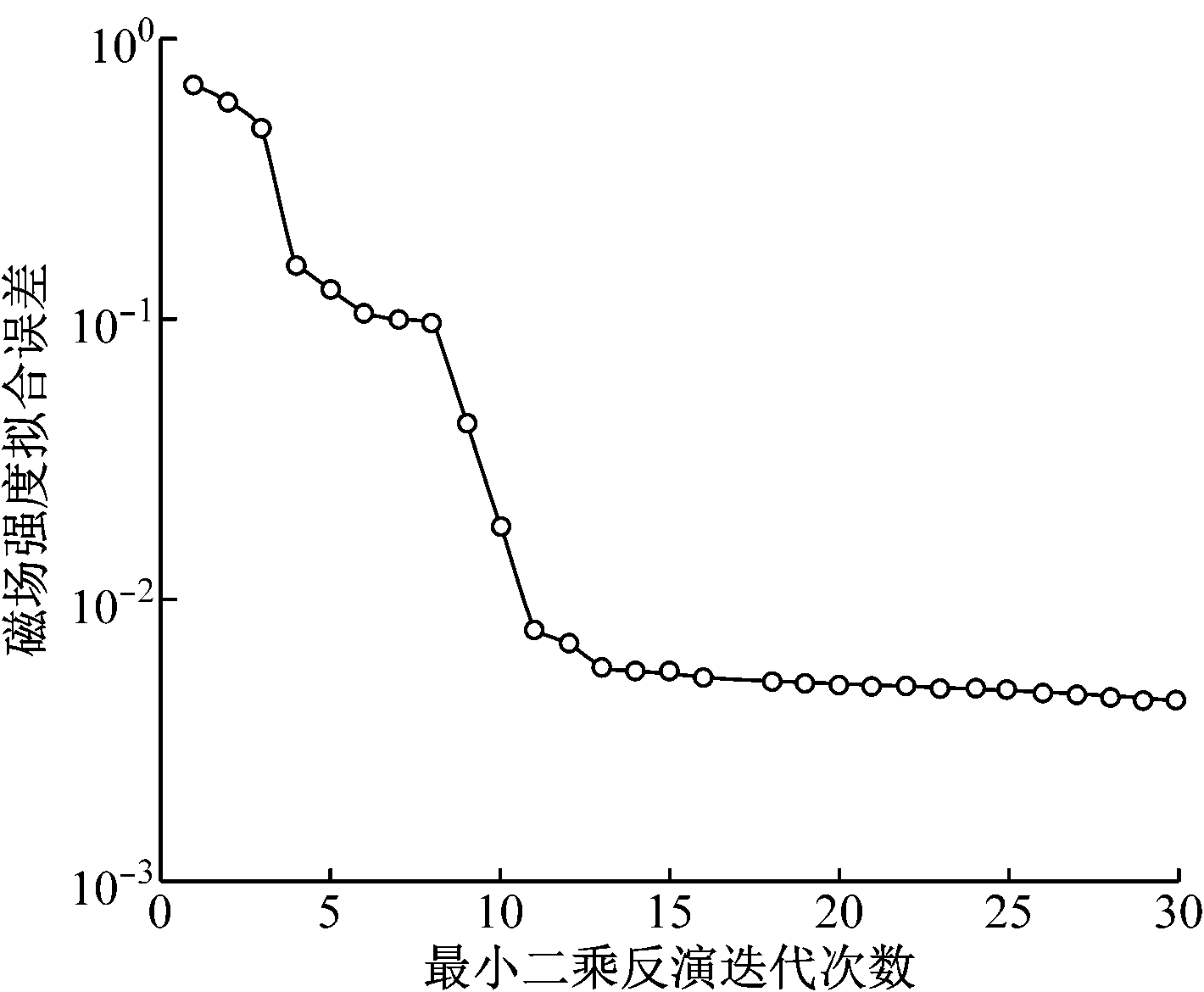磁场强度拟合误差曲线如图6所示。在前11次迭代过程中,随着迭代次数增加,拟合误差迅速下降;到第11次迭代时,拟合误差为0.8%,小于拟合误差精度要求,拟合效果较好;之后,随着迭代次数的增加,拟合误差下降趋势不明显,曲线逐渐趋于平缓;到第30次迭代时,拟合误差仅为0.44%。当迭代次数增大到一定程度时,如果继续增大迭代次数,则拟合误差减小幅度很小,但是反演计算所用时间会成倍增加,反而会降低计算效率。因此,在反演过程中需要选取合适的迭代次数,使得反演后的拟合误差满足精度要求。本次反演计算所用时间为76.592 232 s,计算效率较高。