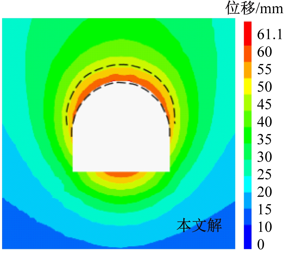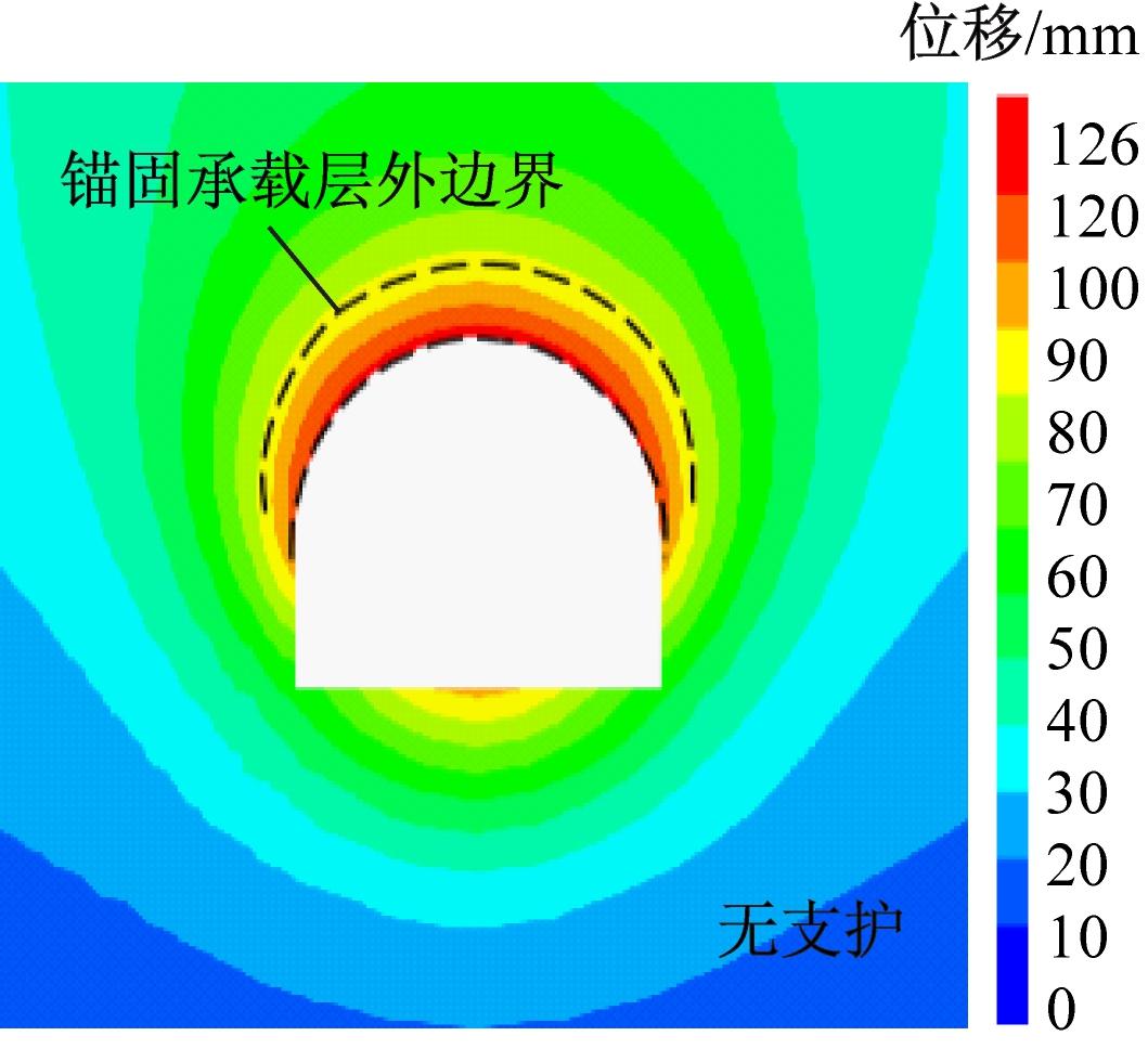 巷道围岩表面位移如图12所示。本文解下的巷道围岩表面位移最大为61.1 mm,算例分析中本文解下的巷道围岩表面位移为56.8 mm,两者相差不大;对比无支护和Fenner解下的巷道围岩表面位移,本文解下的位移量明显减小,锚固承载层的存在对巷道围岩变形具有抑制作用,巷道围岩相对变形量明显降低,锚固承载层承载上覆岩层荷载,对巷道围岩破坏起到了弱化作用,围岩变形量大幅度降低,加强了巷道的稳定性。