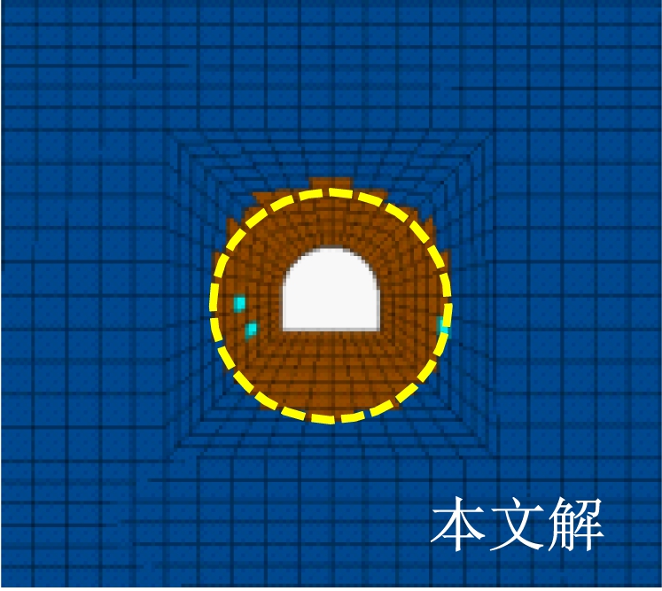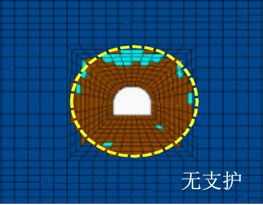 巷道围岩塑性区分布如图11所示。可看出塑性区半径范围为6.6~7.1 m,与算例分析所得塑性区半径6.95 m相近;本文解下的塑性区范围明显比无支护和Fenner解下的小,说明锚固承载层在抑制巷道塑性区发育方面有较好的作用。