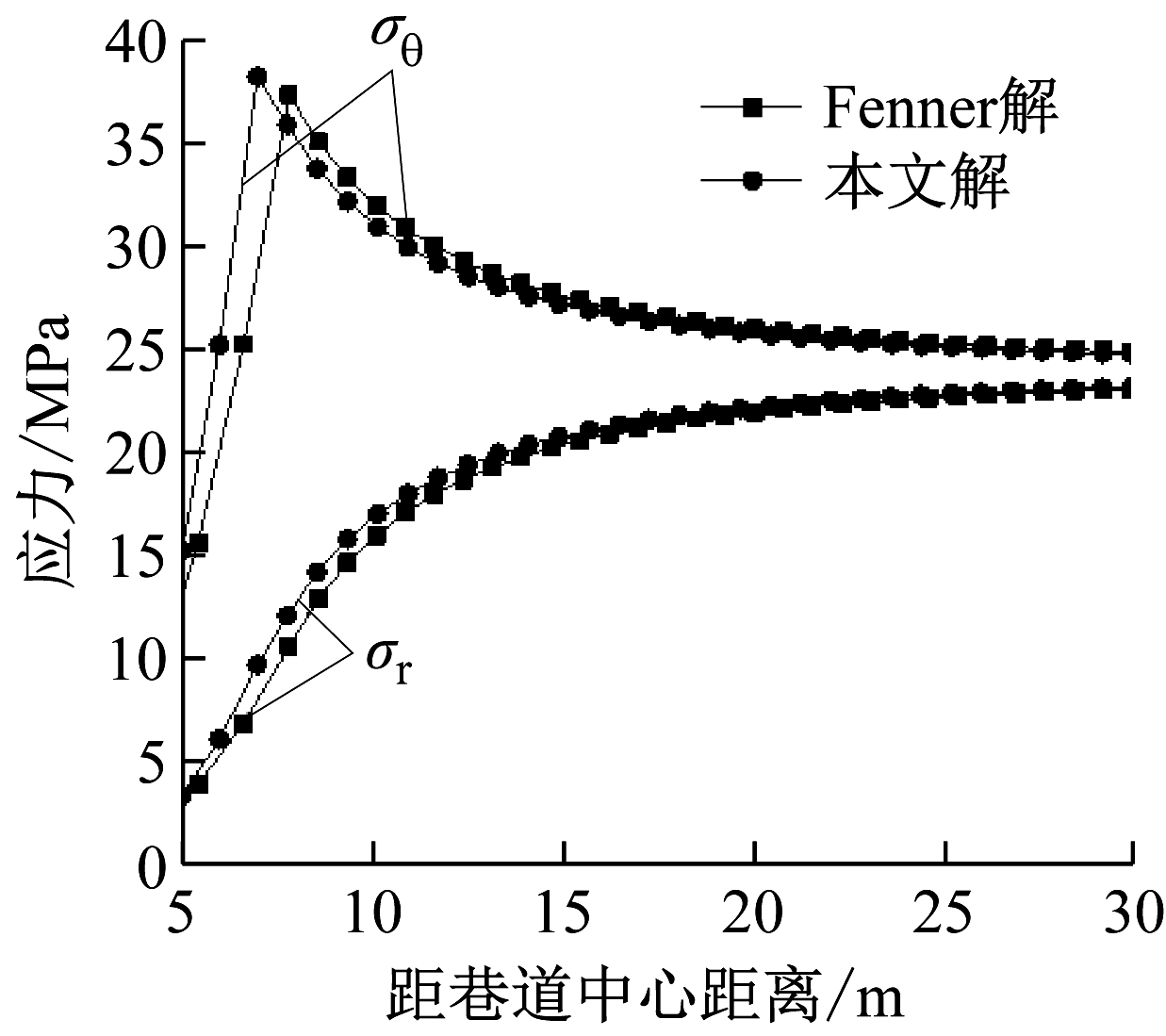 (2) 在塑性区中,相较于Fenner解,本文解下的围岩切向应力较大,应力峰值位置更接近巷道中心位置;在弹性区中,相对于Fenner解,本文解下的围岩切向应力较小,径向应力较大。
