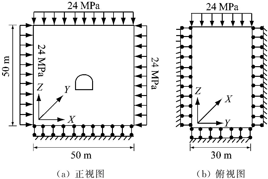 数值计算模型如图9所示。边界条件:设置上表面为自由表面,其余边界采用法向固定约束24 MPa。模型尺寸沿X,Y,Z方向为50 m×30 m×50 m,其中X为巷道断面内的水平横向方向,Y为水平竖向方向,Z为垂直竖向方向。