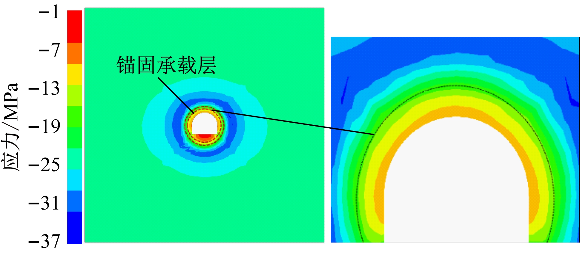 巷道围岩最大主应力云图如图10所示。巷道围岩在开挖后切向应力产生了局部集中区域,该区域内的最大应力为原岩应力的1.5倍,与图5中最大应力一致;径向应力在巷道围岩的周边一定范围发生了强烈的卸荷效应,切向应力与径向应力在巷道周边均存在一定程度的减小。从巷道表面至深部围岩,径向应力逐渐增大并最终趋于原岩应力。锚固承载层主要作用在巷道周边的破裂围岩,巷道周边围岩最大主应力低于原岩应力,锚固承载层的存在对维护巷道稳定有着重要作用。