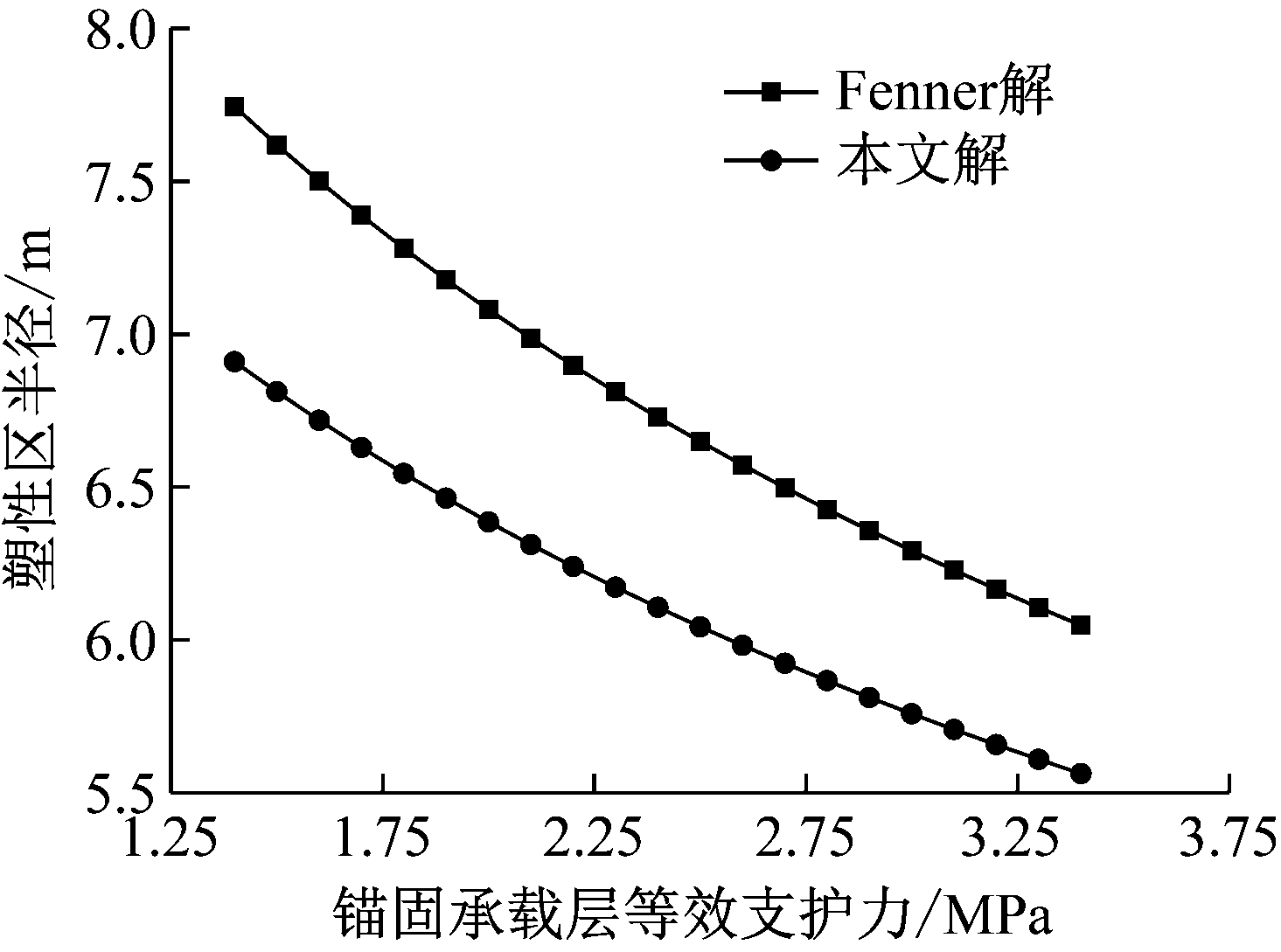 由图6可知,随着锚固承载层等效支护力的增大,本文解与Fenner解下的塑性区半径呈下降趋势,即锚固承载层等效支护力和塑性区半径呈负相关;本文解下的塑性区半径比Fenner解下的减少了8.03%~10.8%。锚固承载层的存在对塑性区发育具有一定的限制作用。