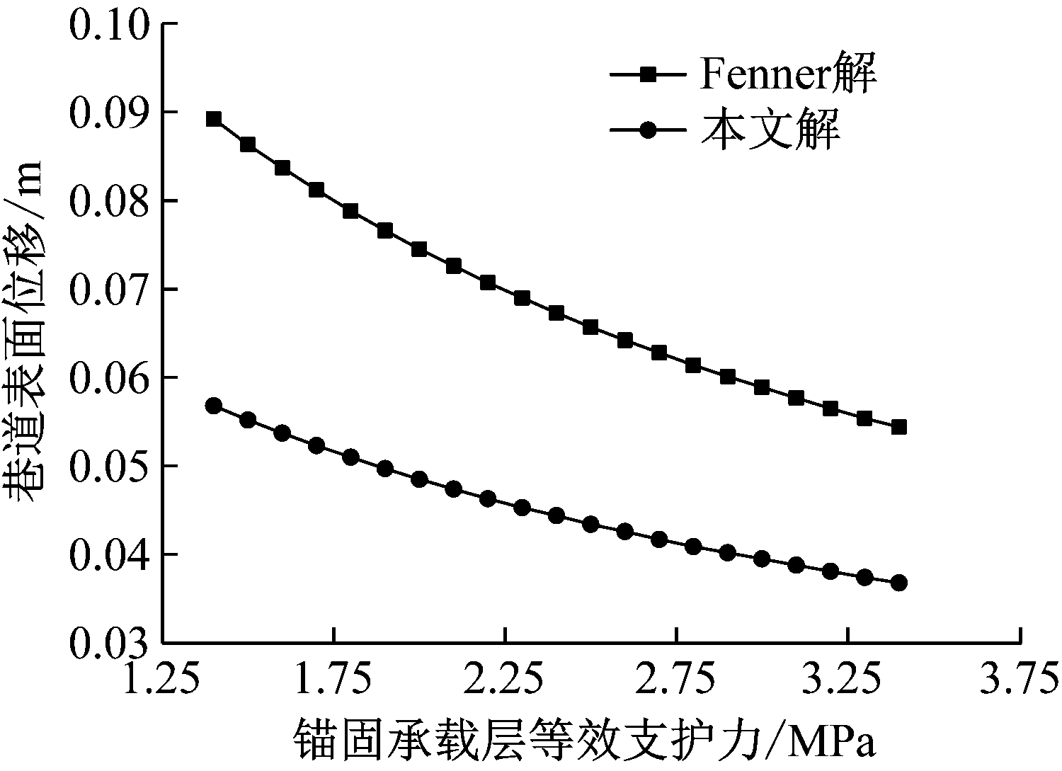 由式(23)可得巷道围岩表面位移与锚固承载层等效支护力关系曲线,如图7所示。随着锚固承载层等效支护力的增大,Fenner解与本文解下的巷道围岩表面位移均减小,且Fenner解下的位移变化量比本文解下的大。