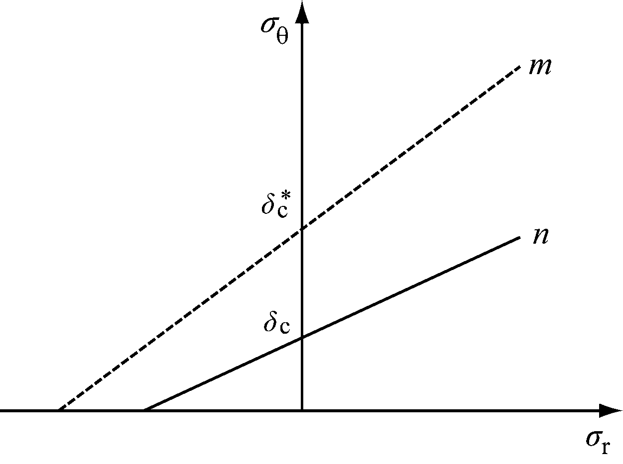 主应力坐标系下的屈服轨迹如图2所示。虚线m为支护后轨迹;实线n为支护前轨迹;
