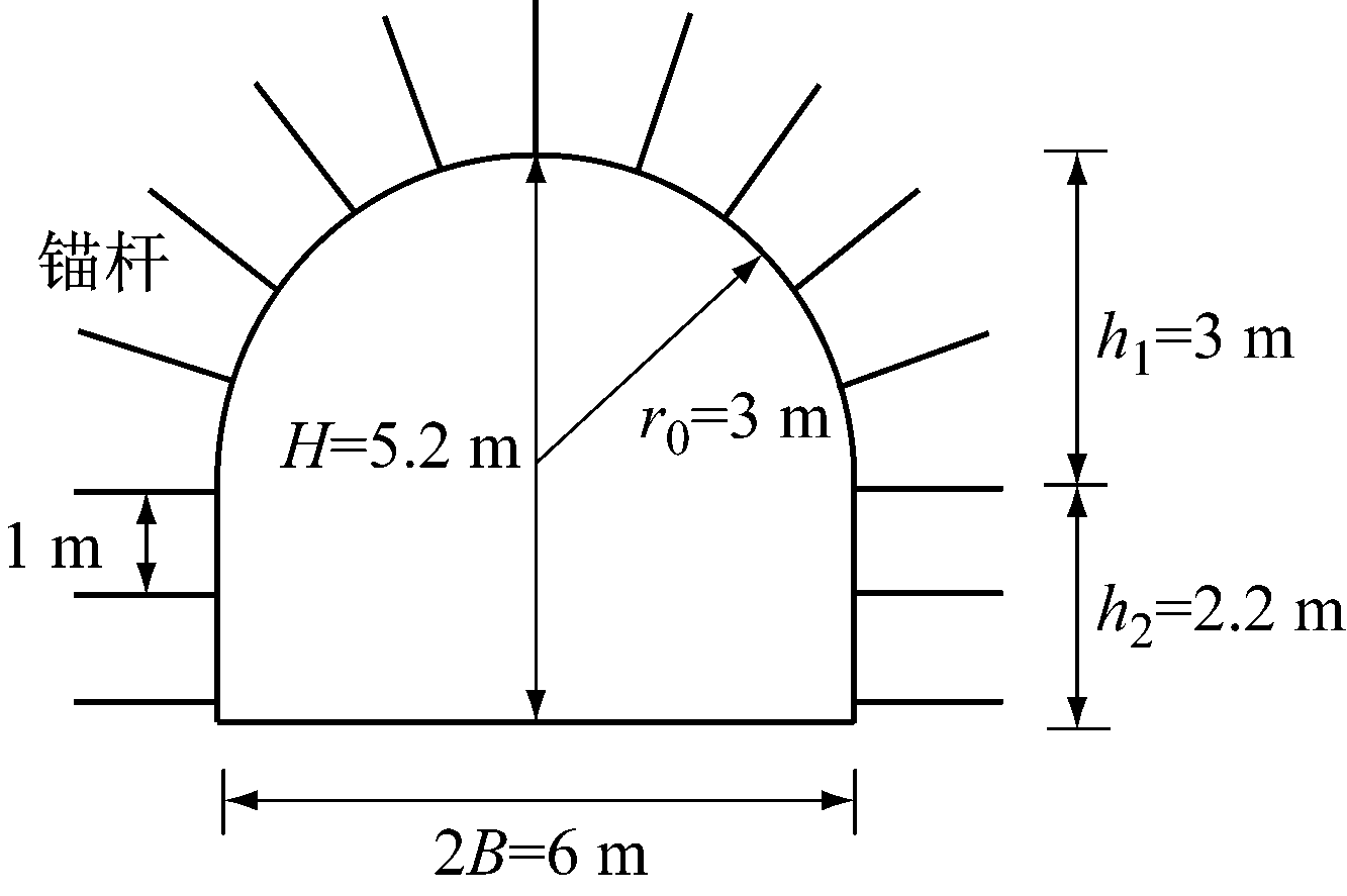 利用Flac3D软件对锚固承载层作用下的巷道围岩应力、塑性区半径和巷道表面位移进行数值模拟。锚杆支护断面如图8所示,巷道断面宽2B=6 m,高H=5.2 m,拱高h1=3 m,墙高h2=2.2 m,锚杆拉拔力Qb=100 kN,弹性模量E=200 GPa。采用φ22 mm×1 800 mm、间排距1 000 mm×1 000 mm的螺纹钢锚杆进行支护。