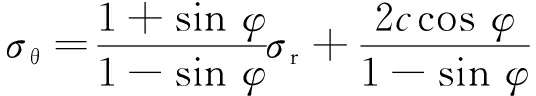式中:σθ为围岩切向应力,MPa;φ为围岩内摩擦角,(°);σr为围岩径向应力,MPa;c为围岩黏聚力,MPa。