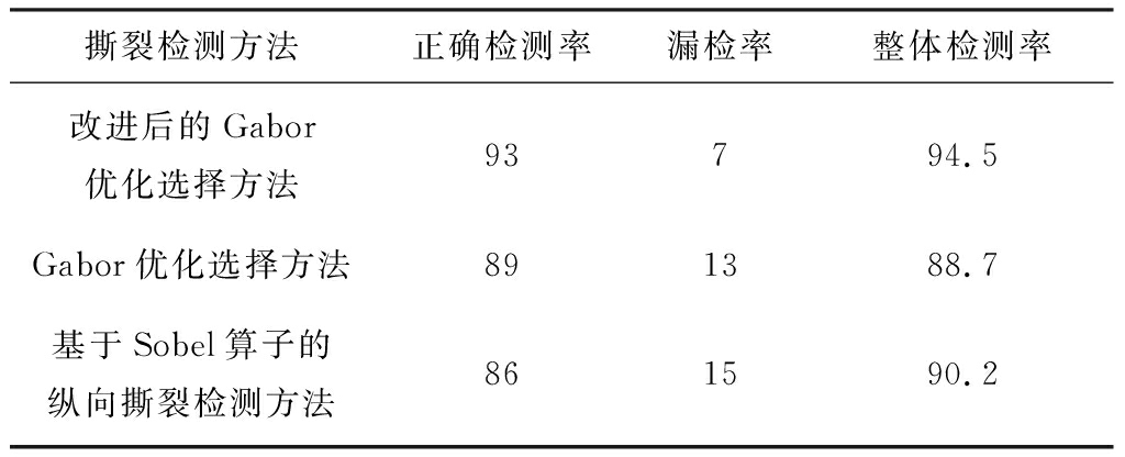 由表1可知,改进后的Gabor优化选择方法整体检测率达到94.5%,且漏检率明显降低。综上所述,改进后的Gabor优化选择方法对背景复杂、裂痕相对不明显的撕裂缺陷有良好的检测效果。