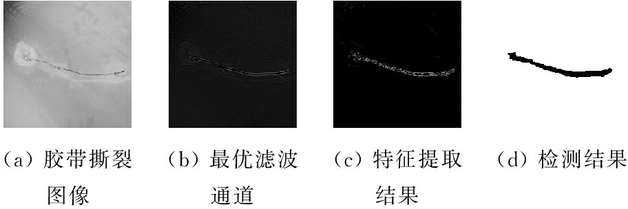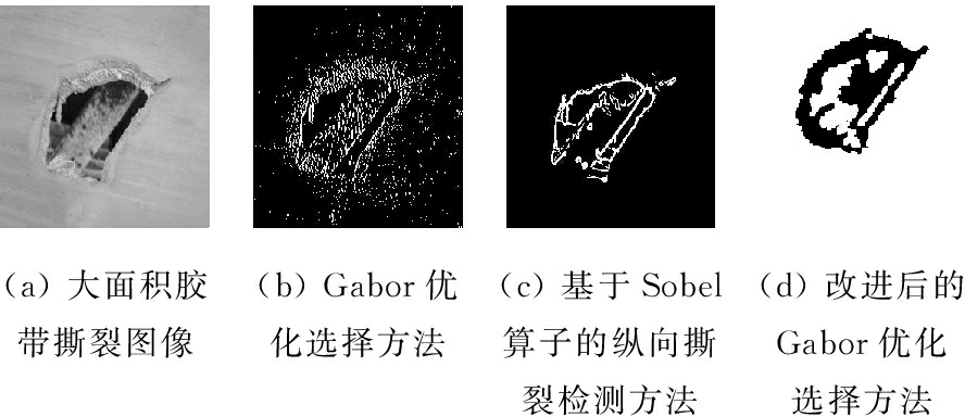 (a) 大面积胶带撕裂图像(b) Gabor优化选择方法(c) 基于Sobel算子的纵向撕裂检测方法(d) 改进后的Gabor优化选择方法