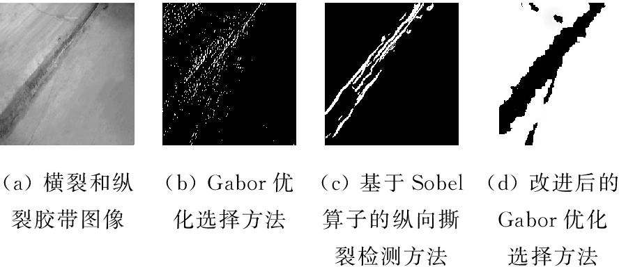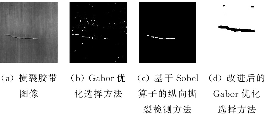 (a) 横裂和纵裂胶带图像(b) Gabor优化选择方法(c) 基于Sobel算子的纵向撕裂检测方法(d) 改进后的Gabor优化选择方法