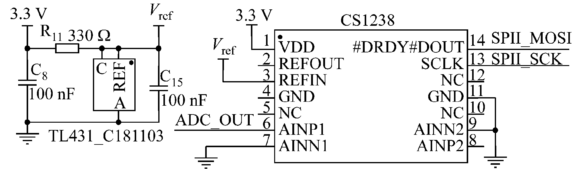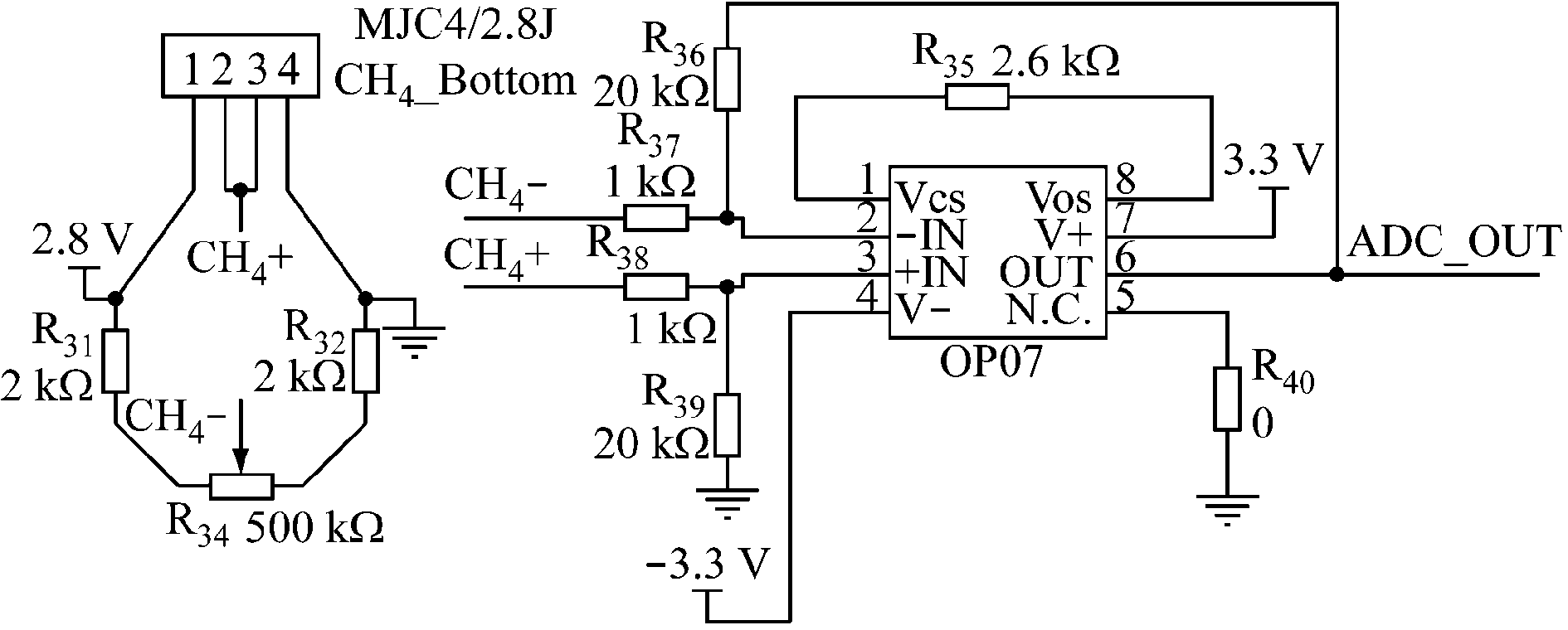 催化甲烷传感器电路模块采用煤矿甲烷检测用载体催化元件MJC4/2.8J[8]与补偿元件构成测量电桥,采用恒流驱动。载体催化元件两端阻值会随气体浓度升高而增大,桥路电压随气体浓度升高而线性增大。通过高精度模数转换芯片CS1238(24位ADC)采集电压值,结合数据处理算法,得出瓦斯浓度。MJC4/2.8J甲烷检测用载体催化元件如图3所示,催化甲烷传感器电路如图4所示。