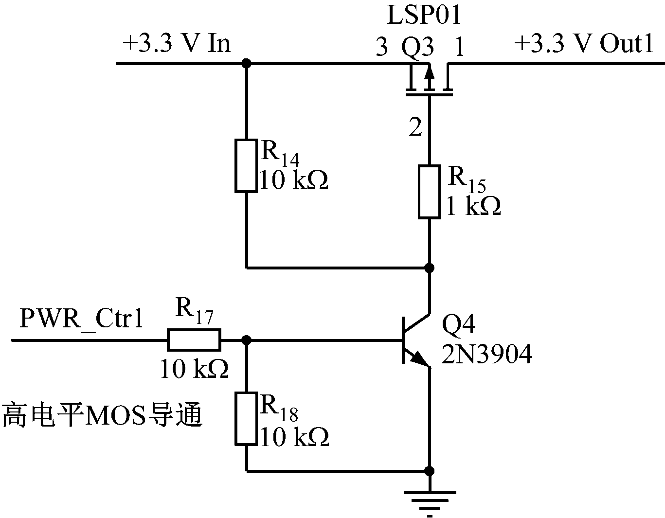 第2部分电源为LoRa无线通信模块、串口通信模块、Flash、电量检测模块、声光报警模块、差分放大器和AD采集电路供电。为合理有效地使用电源,设计了基于MOS(场效应管)的电源开关电路,在单片机的控制下实现电源通断,进而有效降低系统功耗。基于MOS的电源开关电路如图7所示。