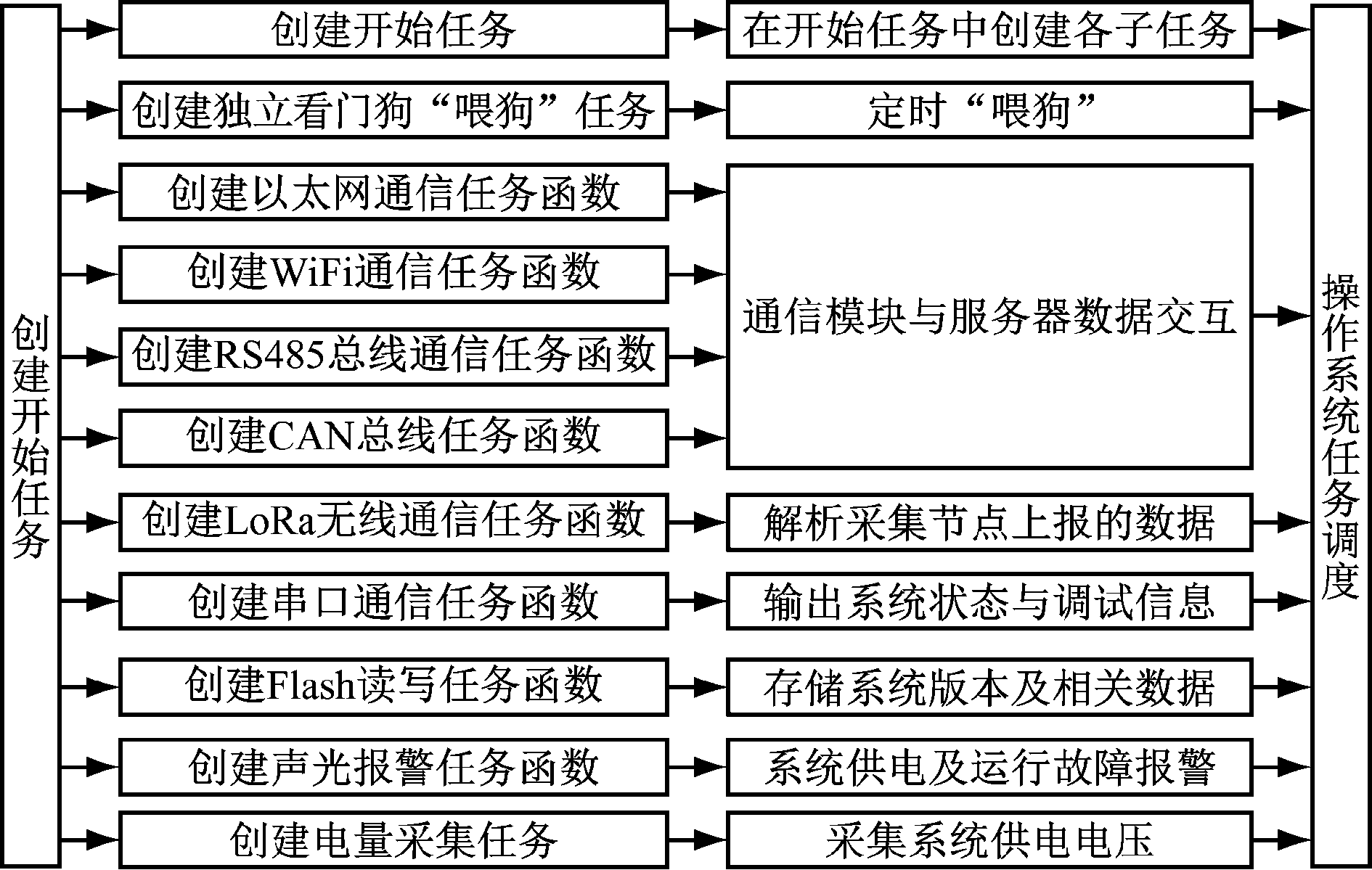 LoRa智能网关的主程序流程如图10所示,在多任务调度执行环节中,根据任务优先级来进行调度,切换执行不同任务。智能网关中的任务分配如图11所示。在实际使用过程中,可根据煤矿井下网络环境选择一种通信方式,根据通信协议编写对应的通信任务函数,将采集到的瓦斯浓度数据汇入工业以太网中。