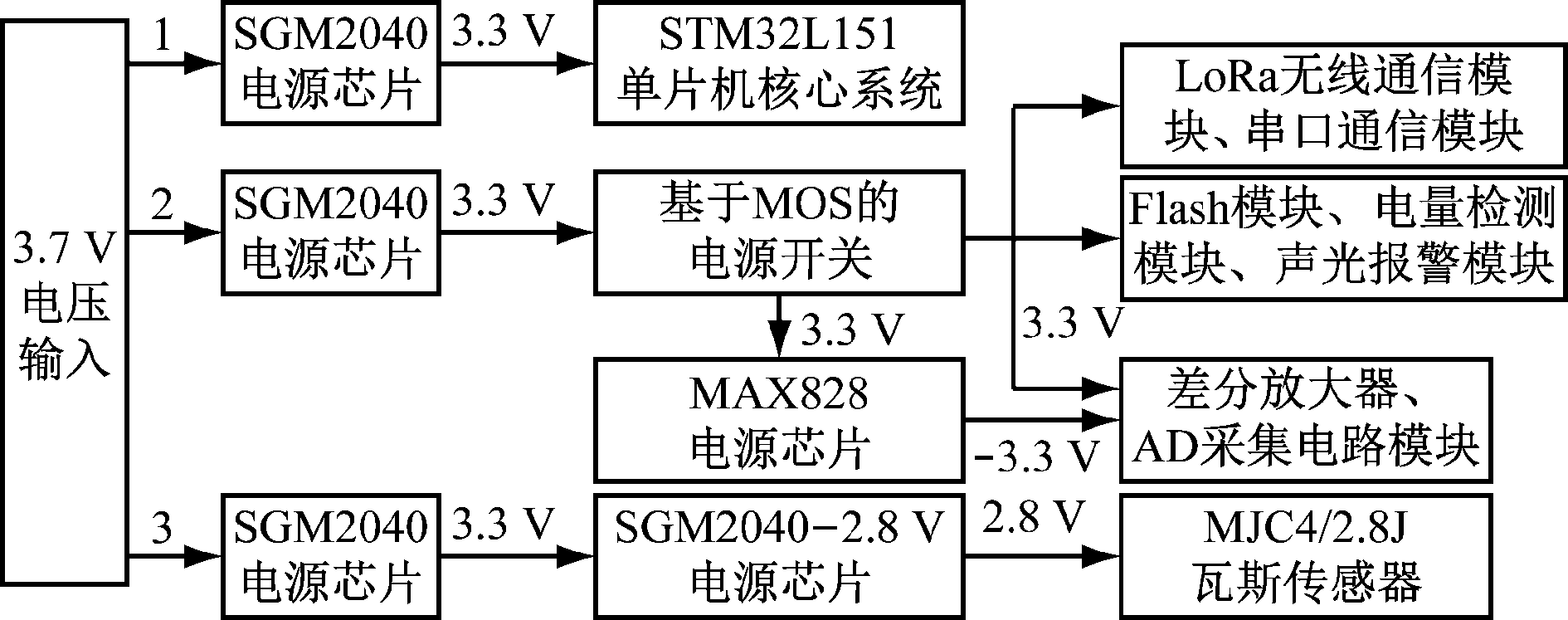低功耗瓦斯浓度采集节点主要包括单片机核心系统模块、电源管理模块和通信模块(LoRa无线通信、串口通信),采用电池供电,其结构如图2所示。