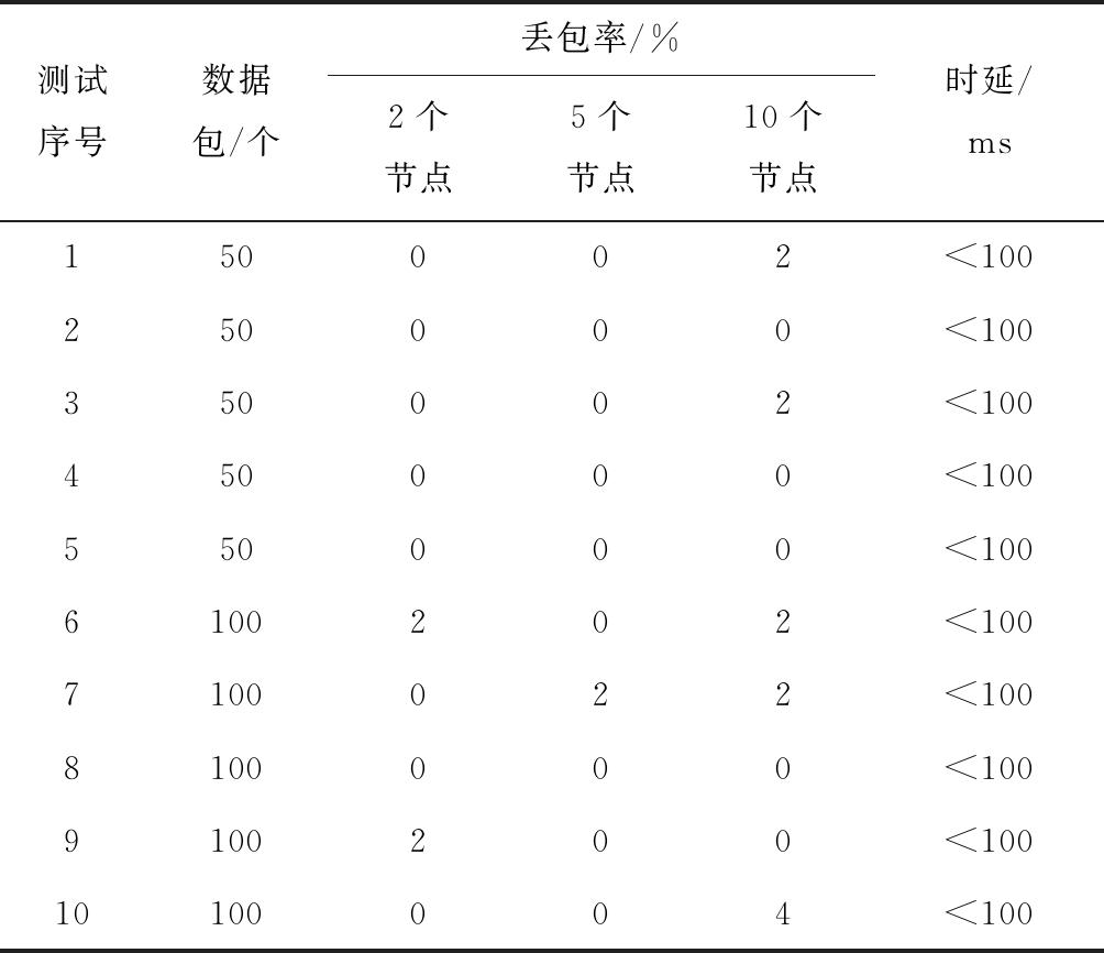 测试序号数据包/个丢包率/%2个节点5个节点10个节点时延/ms150002<100250000<100350002<100450000<100550000<1006100202<1007100022<1008100000<1009100200<10010100004<100