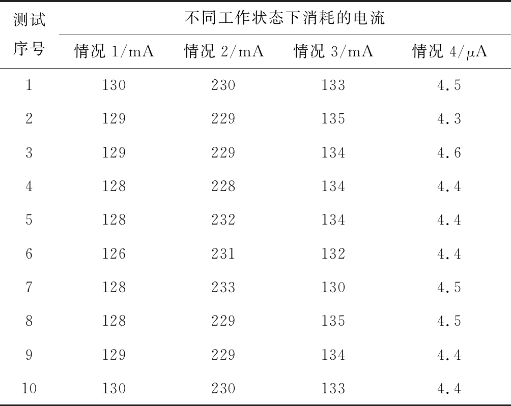 测试序号不同工作状态下消耗的电流情况1/mA情况2/mA情况3/mA情况4/μA11302301334.521292291354.331292291344.641282281344.451282321344.461262311324.471282331304.581282291354.591292291344.4101302301334.4
