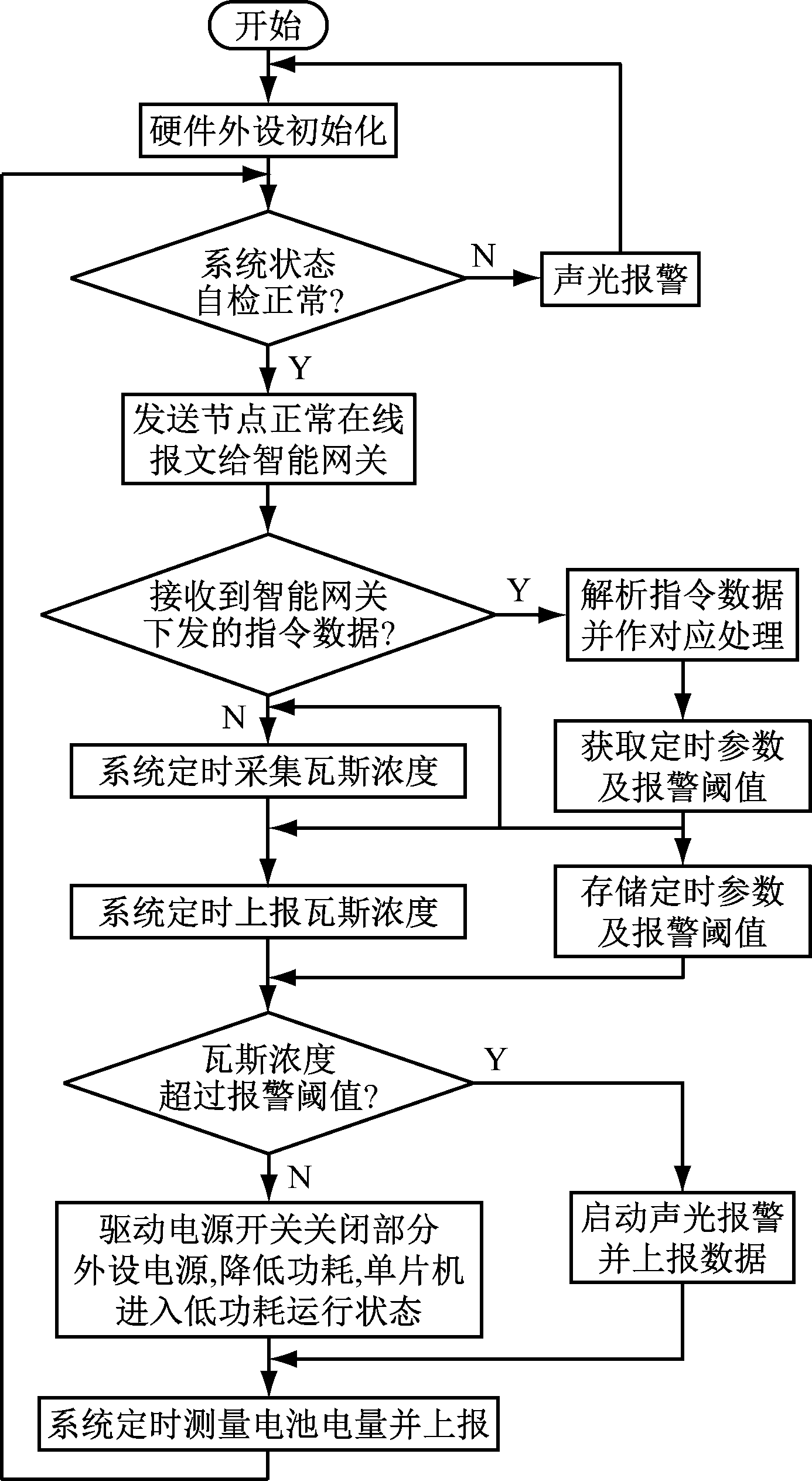 (1) 进行硬件系统外设初始化与系统自检,若系统正常则与智能网关通信,发送在线报文;若系统异常则进行声光报警,并重新进行硬件初始化。