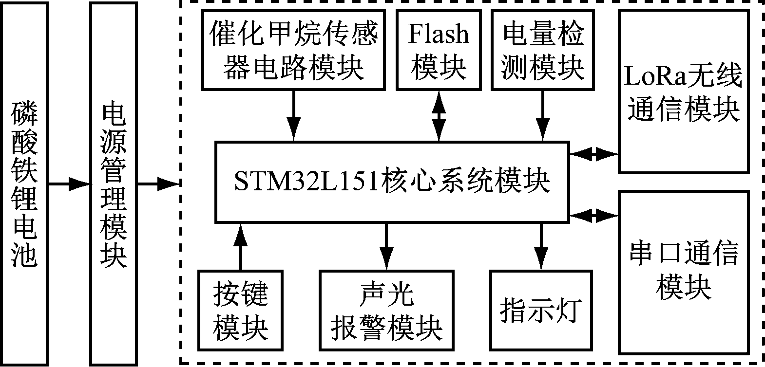 核心系统模块主要包括单片机、催化甲烷传感器电路模块、Flash模块、电量检测模块、按键模块、声光报警模块和指示灯。